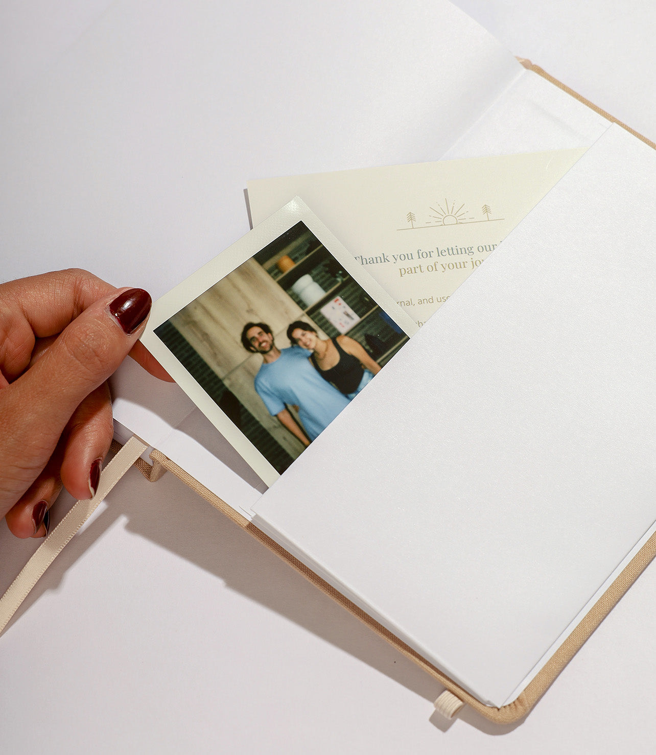 Use the pocket in the back of your journal to keep special photos, notes, receipts or even memorabilia from meaningful events or experiences you encounter along your journey.