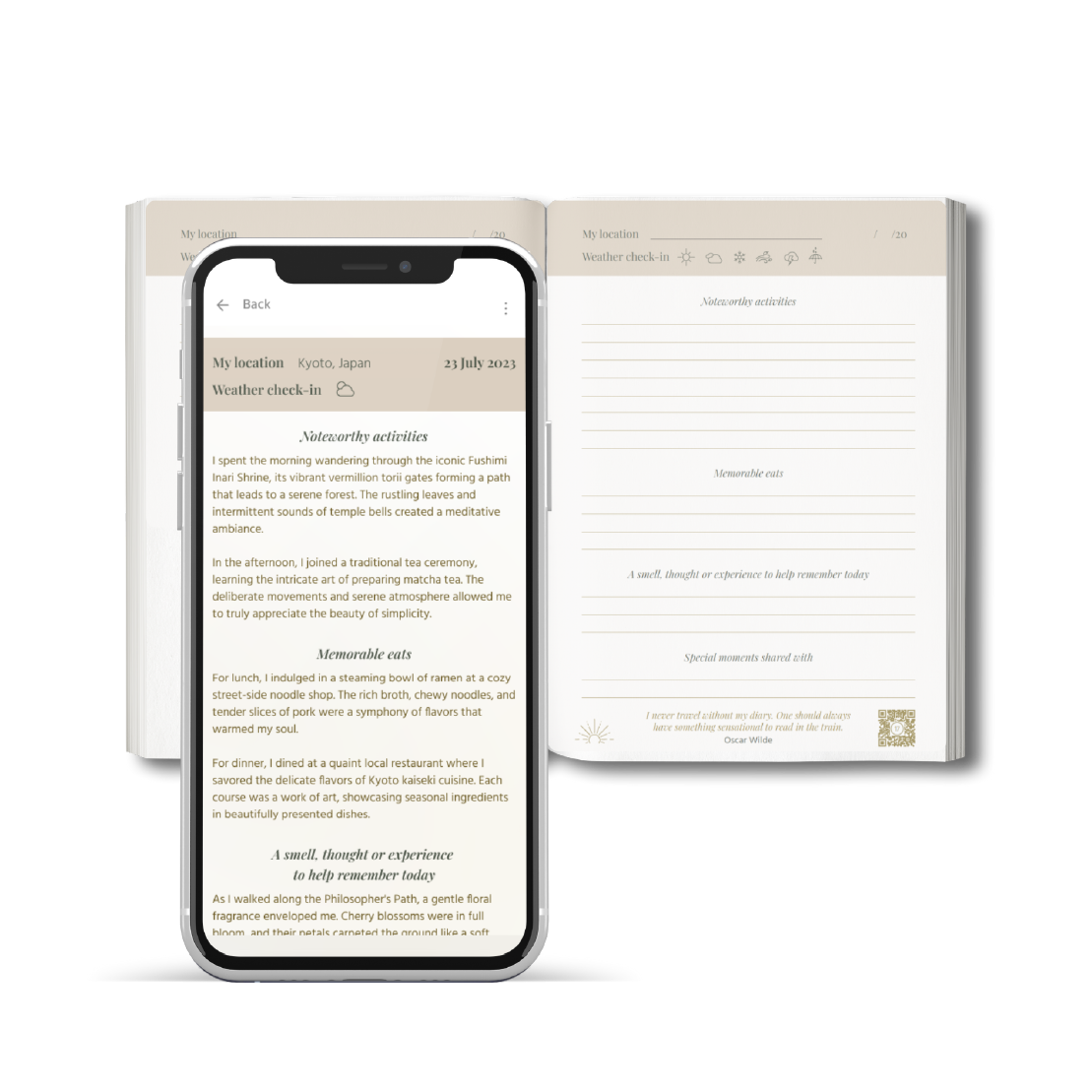 Learn more about the physical travel journal >Owners of the physical Journalfy travel journal can confidently create a digital backup of their paper journal entries by scanning the QR code, preserving their memories for convenient access from anywhere, at any time.
