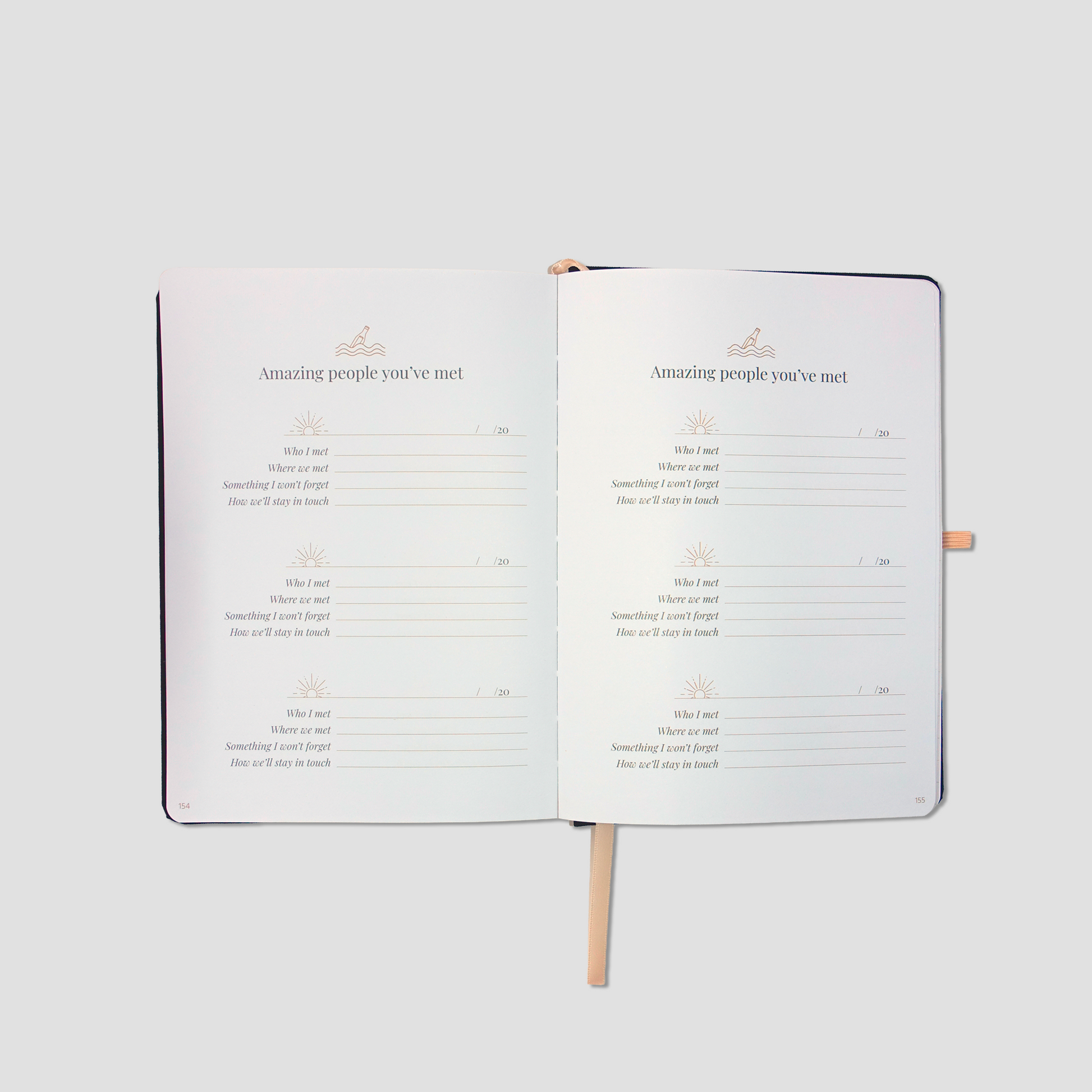 Bound in soft linen and printed on FSC-certified paper, this 172-page prompt-less journal gives you the space to write, sketch, or create however you like. Inside, you’ll find 122 blank-lined pages for writing, 20 sketching and drawing pages for when words aren’t enough, and six dedicated pages to remember the people you’ve met along the way. Each lined page features an inspiring quote to spark reflection and creativity as you journal.